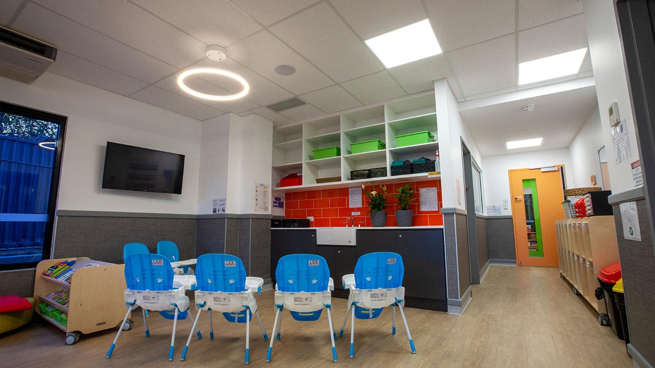 The project included perimeter wall construction, custom play pods with high-quality finishes, and a full internal fit-out featuring partitions, suspended feature ceilings, and new floor finishes. Bathrooms were completed with DDA-compliant amenities, while a commercial-grade kitchen with mechanical exhaust and ventilation supports daily operations.